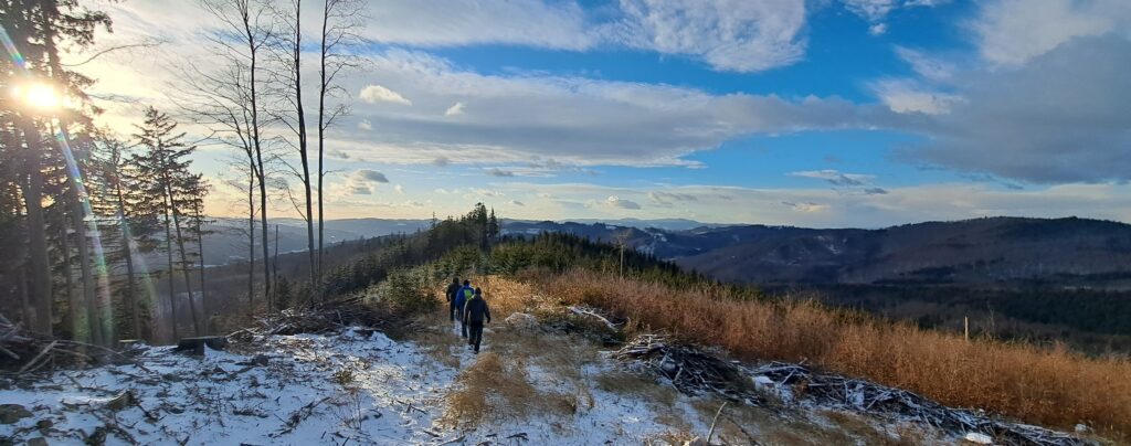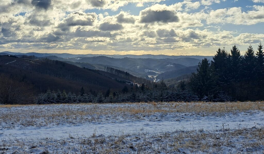 Hádající se cylisté hledají Velkou Javořinu a Doubravu…..sedlo pod Cábem(výhled směr Vsetín)